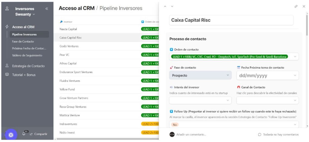 - Fase de contacto: Aquí podrás indicar en qué fase te encuentras con el inversor, como “Prospecto” si aún no has establecido contacto, o “Esperando intro de un tercero” si estás gestionando una introducción a través de alguien más. Cada actualización aquí se reflejará automáticamente en la pestaña de “Fase de contacto,” permitiéndote un seguimiento organizado.