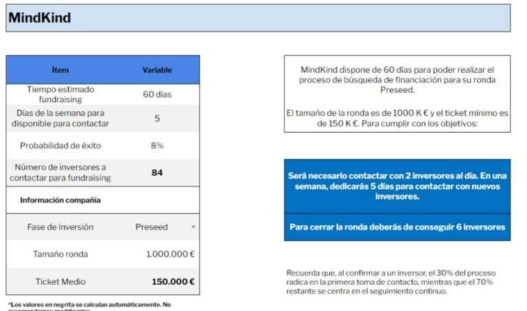 Basado en el tiempo que tienes disponible, los días que puedes dedicar a contactar inversores, y la probabilidad de éxito de cada contacto. Esto te ayuda a tener una hoja de ruta clara y evitar que el proceso de búsqueda de inversión se alargue más de lo necesario.