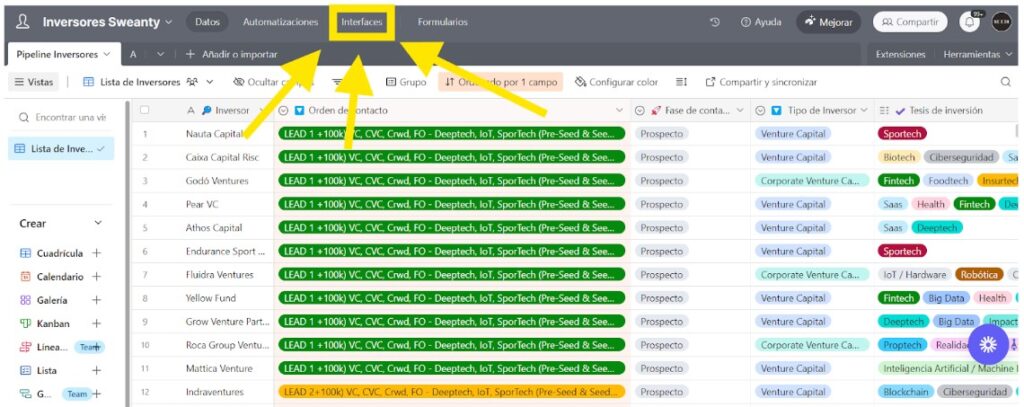 Una vez que estés dentro, notarás que se presenta una vista tipo Excel que puede parecer poco intuitiva al principio. No te preocupes, para acceder a la vista de CRM que hemos preparado, dirígete al menú superior y haz clic en “Interfaces,” que aparece en la parte superior izquierda de tu pantalla, tal como se muestra en la imagen subrayado en color amarillo. Esta opción te llevará a la vista organizada y fácil de usar del CRM, donde podrás gestionar y hacer seguimiento a tus contactos con inversores de manera eficiente.