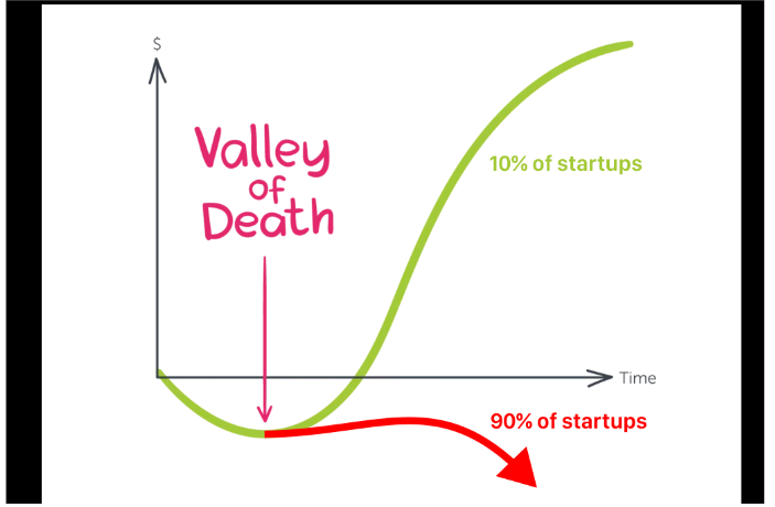 Jaime destaca que en el mundo de las startups, es común que al principio las empresas necesiten hacer grandes inversiones para construir su producto, escalar operaciones o captar clientes. Durante esta fase, conocida como la parte descendente de la J-Curve, los costos superan significativamente los ingresos, lo que genera pérdidas. Esta es la fase crítica que muchas startups deben soportar, conocida comúnmente como “el valle de la muerte”, donde el riesgo de agotarse financieramente es alto.